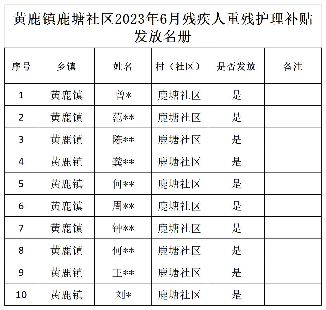 黄鹿镇鹿塘社区2023年6月残疾人重残护理补贴发放名册