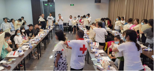 7月13日,县红十字救护培训师资再次来到金诚房产总部,为团县委、玄武社区、秋和文化组织的一批大学生志愿者和社区群众送去一场生命教育课程。基于学员们前期已通过线上理论培训,本次课程对实际操作做了重点讲解和练习,解决了大家关心关注的热点、难点问题,还特别就防溺水及溺水后自救互救的技术要点进行了积极探讨和总结。