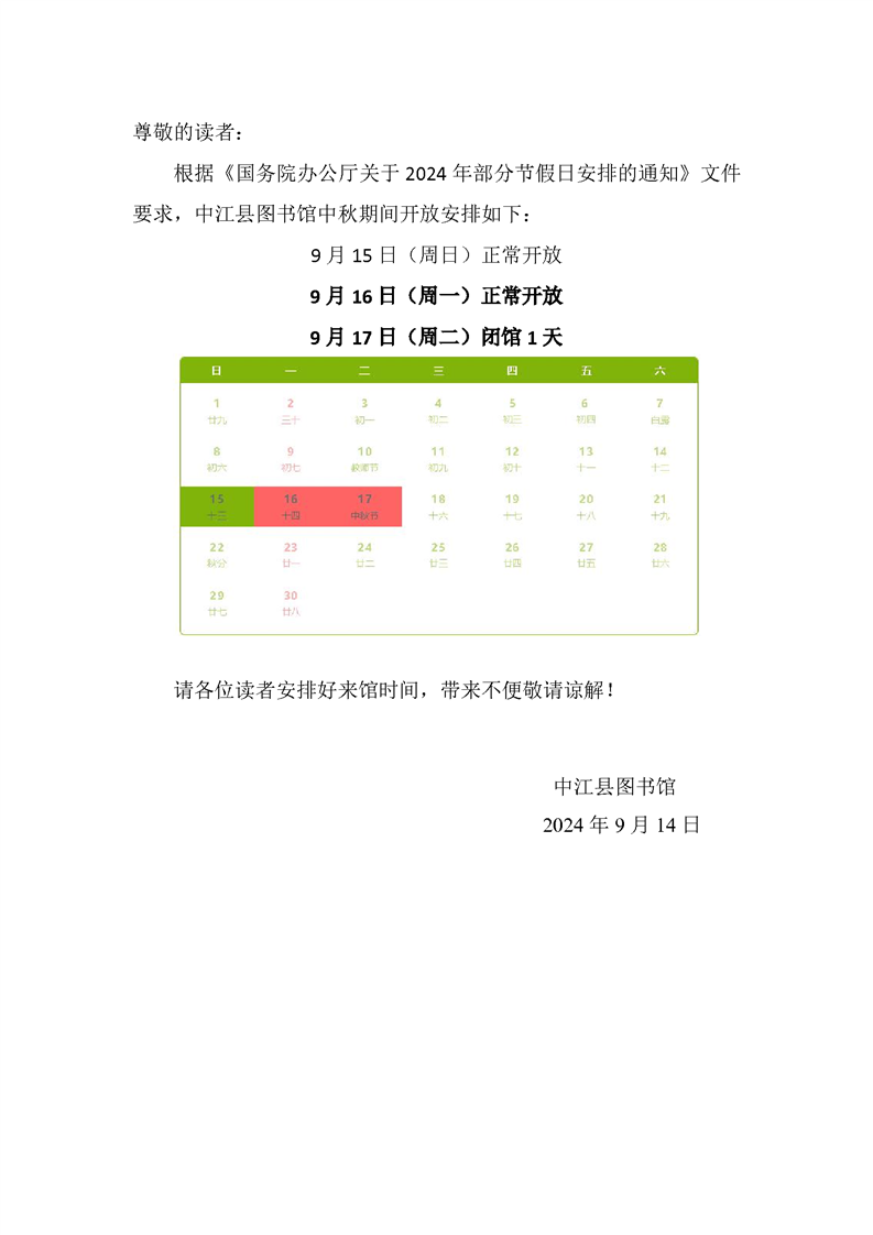 开馆时间通知|关于中江县图书馆2024年中秋节假期开放时间安排