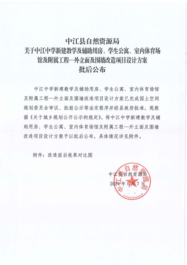 中江县自然资源局关于中江中学新建教学及辅助用房、学生公寓、室内体育场馆及附属工程——外立面及围墙改造项目设计方案批后公布