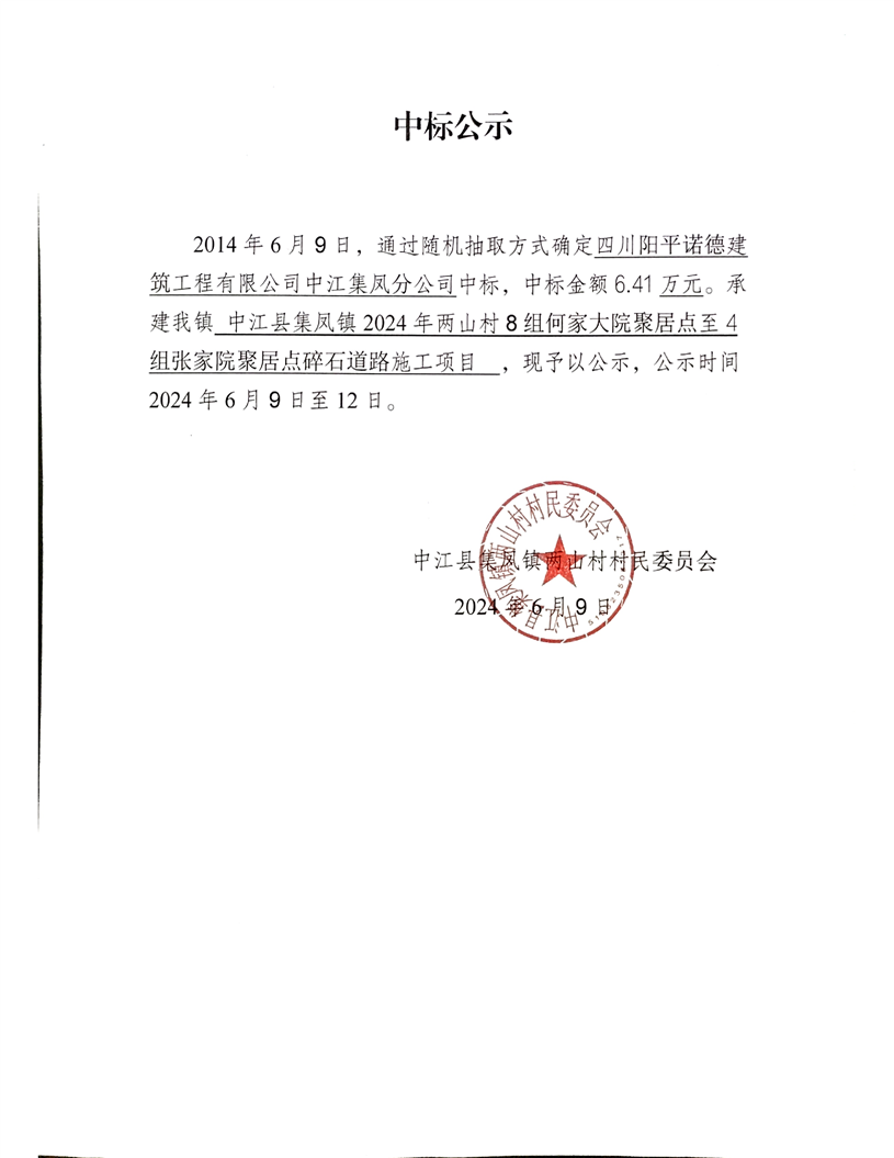 中江县集凤镇2024年两山村8组何家大院聚居点至4组张家院聚居点碎石道路施工项目中标公示